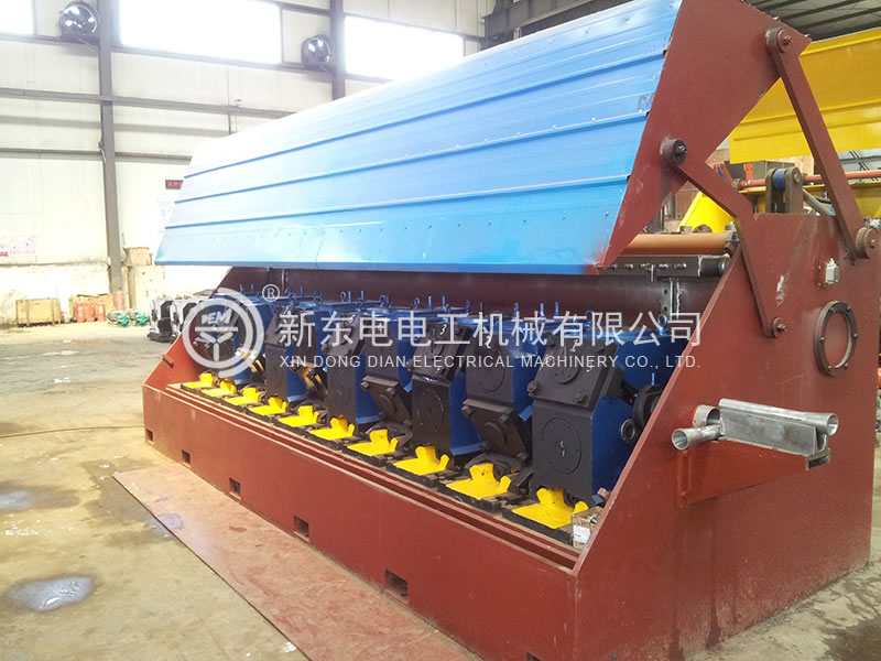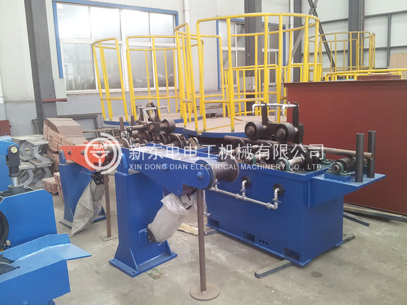 本生產線主要由四輪式連鑄機(專利號:ZL 2009 2 0037329.X; 澆鑄機用零點澆鑄裝置,專利號:ZL 2009 2 0037330.2)、校直機、前牽引機、滾剪機、鑄坯過渡支撐裝置、喂料機、粗軋機、精軋機、鋁桿冷卻淬火裝置、鋁桿甩桿成圈裝置、收線小車及收線筐裝置、連鑄連軋生產線電氣控制系統、連軋機潤滑油系統、連軋機乳液循環系統等組成。